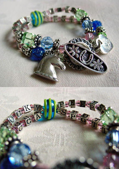The Dazzle Namecube Bracelet features hand blown glass, blue, green, and pink Swarvoski crystals, larger hand blown pink and blue glass beads, and silver Bali beads — along with up to four names, spelled out in beads. The piece can be further personalized with an engraved silver heart charm: a great gift for a riding instructor or team coach!